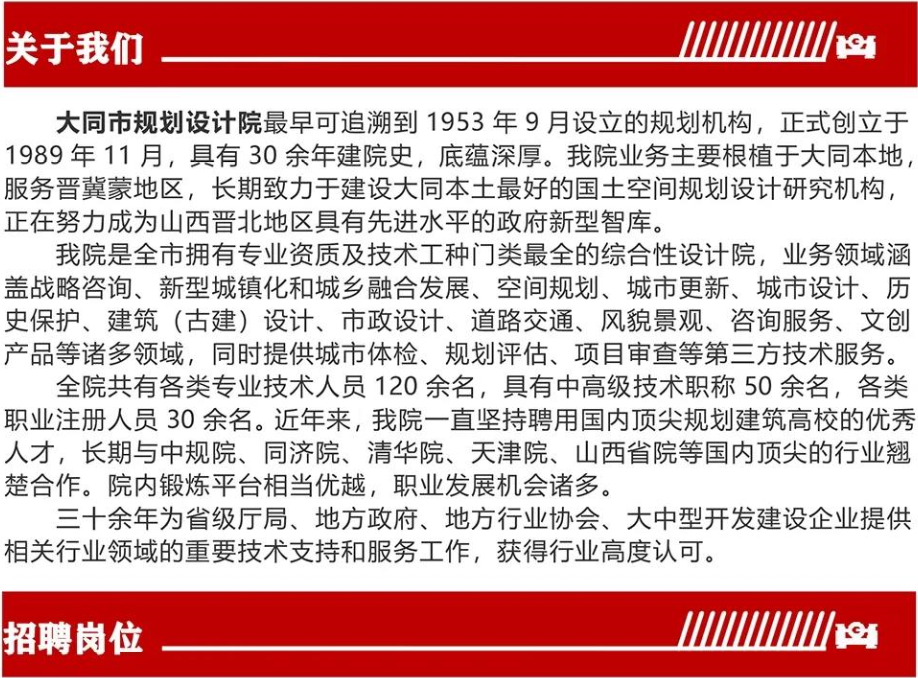 大同市規(guī)劃設(shè)計(jì)院,成立于1989 年11 月。是大同市城鄉(xiāng)規(guī)劃局下屬的全民事業(yè)單位,是以城市規(guī)劃為主體的具有城市規(guī)劃甲級(jí)資質(zhì),市政公用行業(yè)乙級(jí)資質(zhì),建筑工程設(shè)計(jì)乙級(jí)資質(zhì)、工程咨詢丙級(jí)資質(zhì)的綜合性設(shè)計(jì)院。